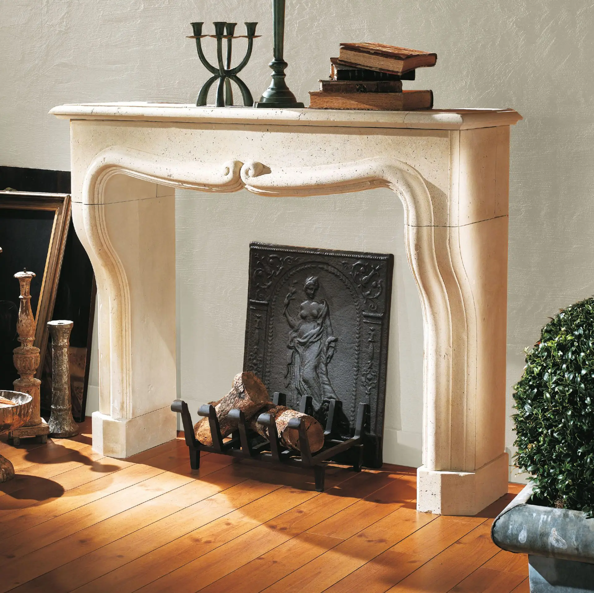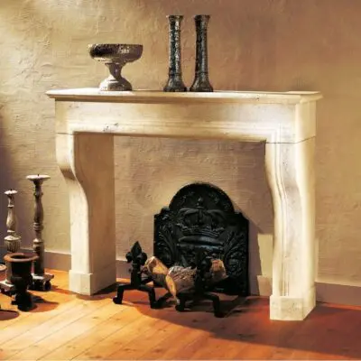 Full front fireplace. Mauzens stone. 5 sand bricks, hand molded. Beam and assorted furniture. Oak beam and oak plated.